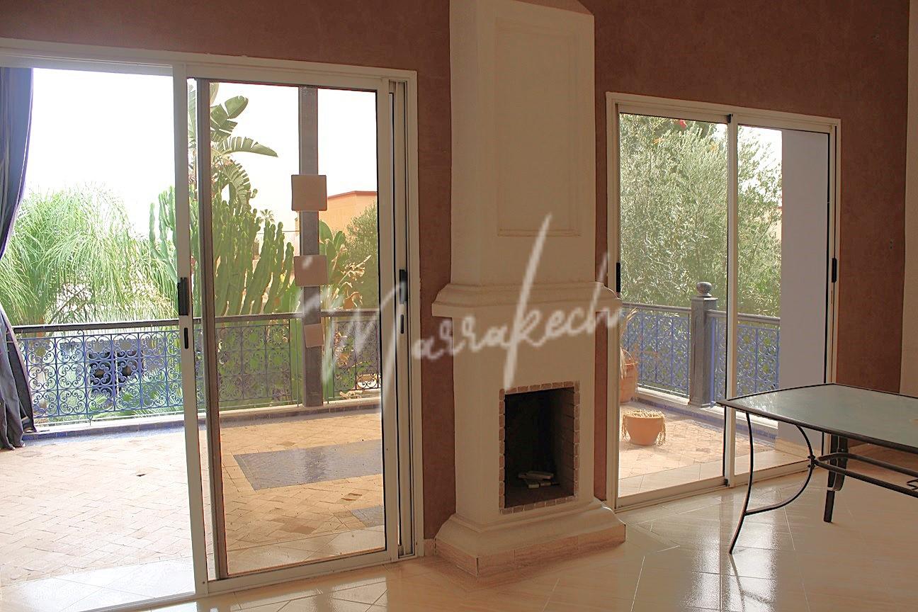 Votre agence immobilière In Marrakech a le plaisir de vous proposer dans une charmante petite résidence avec piscine située sur la route de l’Ourika à 10 minute de Carrefour AL MASAR des appartements de 140m² en rdc ou au 1e étage A LOUER VIDE comprenant une entrée, un beau séjour avec cheminée donnant sur une grande et belle terrasse, cuisine, toilette réception, deux chambres avec salle d’eau