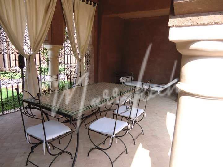 Nichée à la légendaire Palmeraie de Marrakech, à 20 min du centre ville, InMarrakech vous propose à la vente cette chaleureuse villa qui dispose d’ un patio-fontaine, et qui comprenant au Rez-de- chaussé : Une jolie chambre en suite, avec salle d’eau et WC séparé , une très grande réception qui comprend un salon marocain avec un coin cheminée, ainsi qu’une salle à manger donnant sur le patio de cette jolie demeure, elle dispose aussi dune cuisine entièrement équipée, cellier, et entrée indépendante pour le personnel.