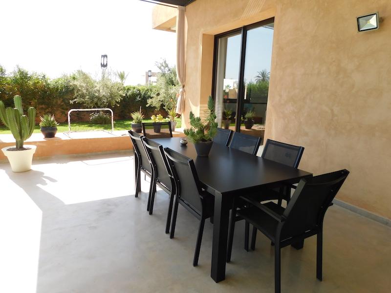 Cette villa contemporaine est meublée avec soin. Ses espaces et sa luminosité sont des valeurs ajoutées. Environnement de qualité sur le golf d'Amelkis.